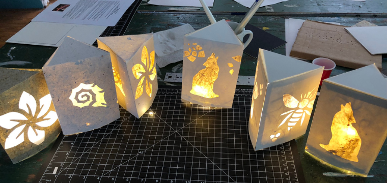 You’ll be cutting and folding as part of the process. Using stencils, you can cut shapes with either an Xacto knife or a pin tool, each offering unique effects, before assembling your lantern. The session also offers a brief look at the historical and contemporary importance of lanterns.